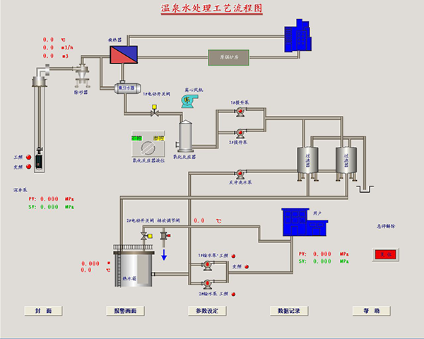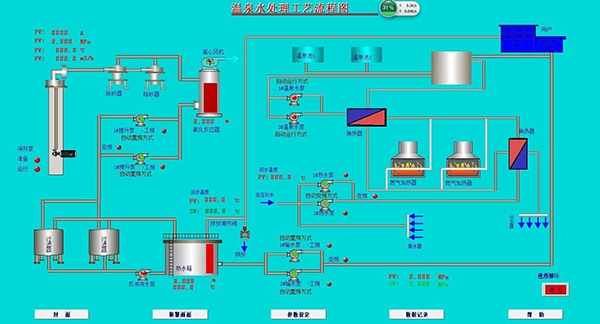 溫泉水綜合利用系統(tǒng)是利用從地下采到的溫泉水(溫度很高),首先與采暖循環(huán)系統(tǒng)進(jìn)行熱交換后用于建筑內(nèi)采暖,被降溫后的溫泉水通過(guò)除硫化氫、除鐵等水處理工藝后用于人們的溫泉浴,再多余的溫泉水可以用來(lái)養(yǎng)殖。溫泉水是一種礦產(chǎn)資源,它不是取之不盡,用之不竭的,應(yīng)合理地開(kāi)采和利用。采用該計(jì)算機(jī)控制系統(tǒng)可以實(shí)現(xiàn)溫泉水自動(dòng)按需取水,較大限度地節(jié)約礦產(chǎn)資源。另外該控制系統(tǒng)還具有自動(dòng)供水,自動(dòng)水處理(自動(dòng)反沖洗),采暖回水溫度與溫泉水排放溫度自動(dòng)調(diào)節(jié)等功能,實(shí)現(xiàn)溫泉水的理想利用。